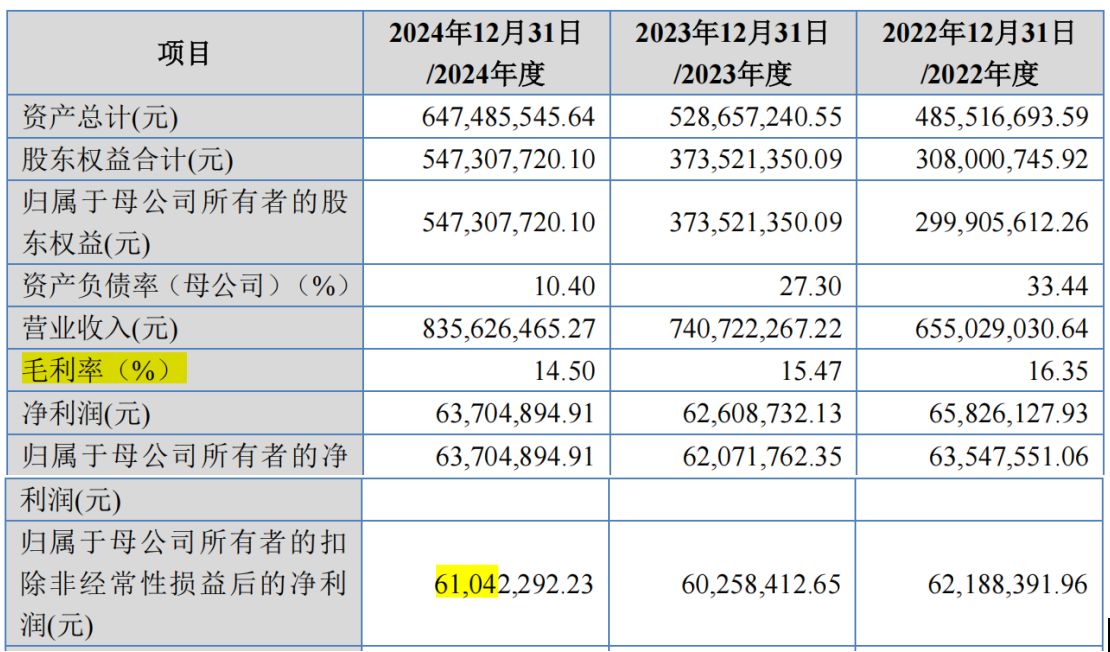 招股书显示,报告期内,博韬合纤的营业收入分别为6.55亿元、7.41亿元和8.36亿元,扣非后归母净利润分别为6218.84万元、6025.84万元和6104.23万元。