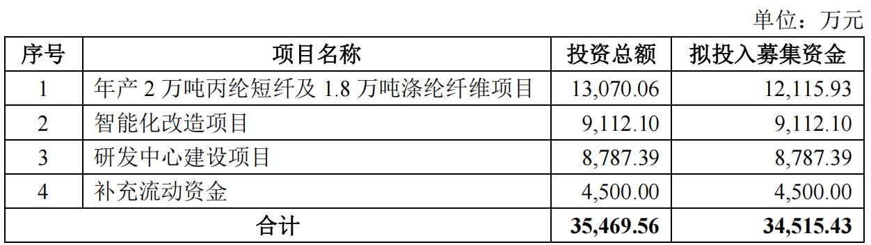 博韬合纤拟通过本次IPO募资约3.45亿元,用于年产2万吨丙纶短纤及1.8万吨涤纶纤维项目等3个项目以及补充流动资金。上述IPO募投项目预计将为博韬合纤的丙纶短纤和涤纶短纤分别提升产能约26.85%和128.57%。