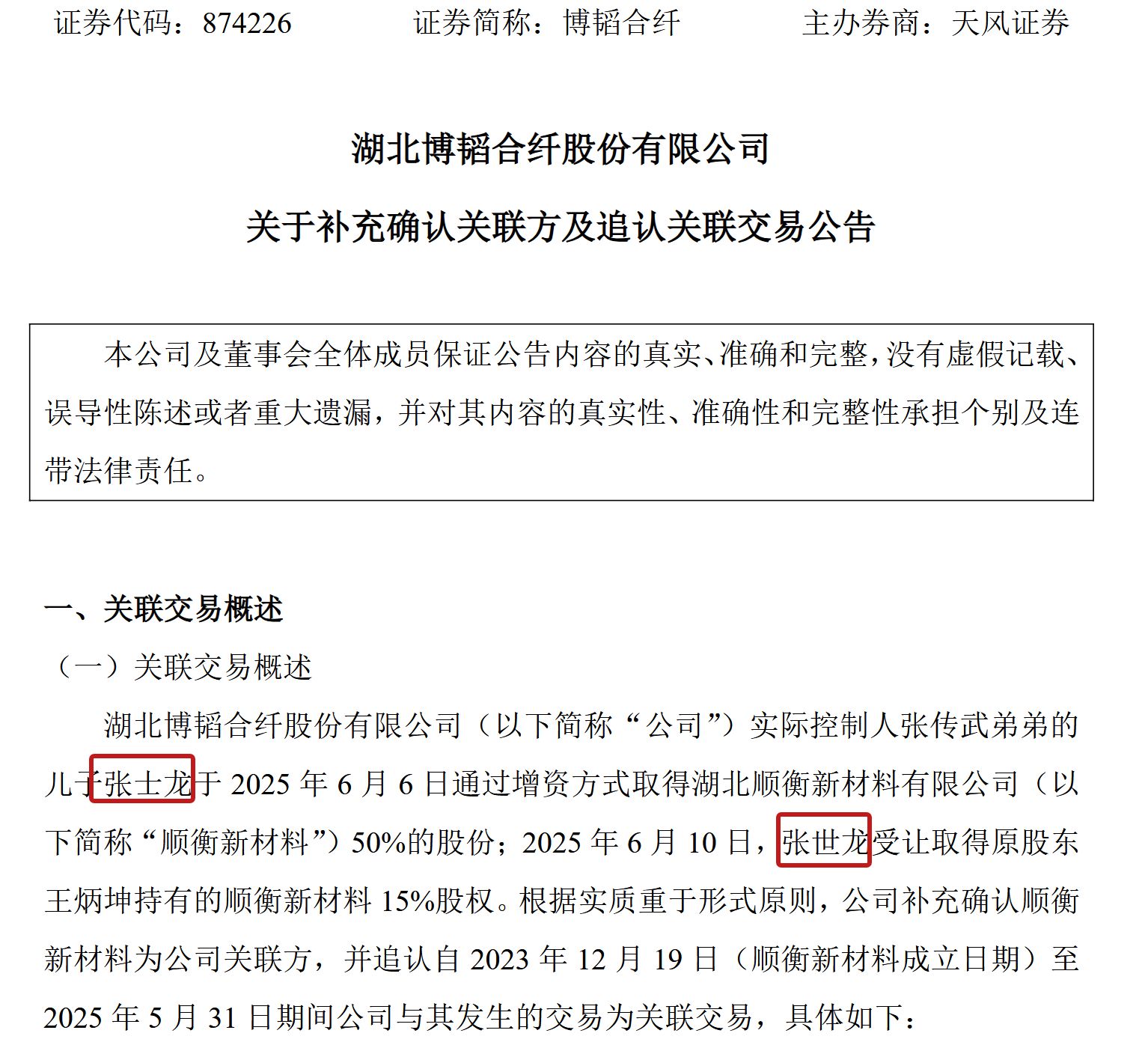 上述公告显示,博韬合纤实控人张传武弟弟的儿子张士龙于2025年6月6日通过增资方式取得湖北顺衡50%股份;2025年6月10日,张世龙受让取得原股东王炳坤持有的湖北顺衡15%股权。根据实质重于形式原则,博韬合纤补充确认湖北顺衡为公司关联方。